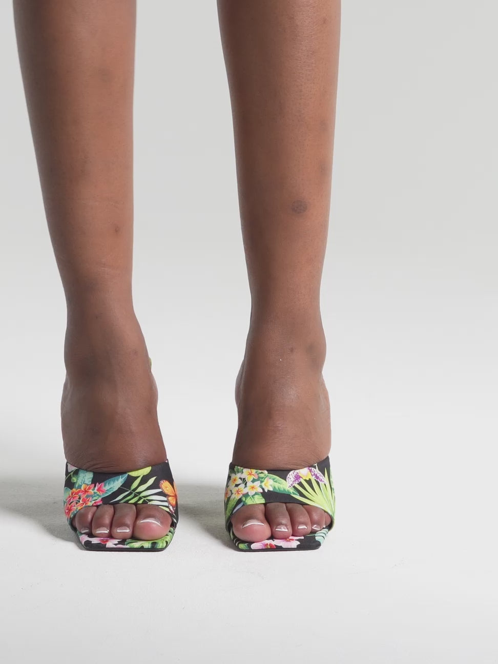 Paradise sandals for an exotic girl like you. Open toe block high heels with tropical pattern. Where wild meets elegance.